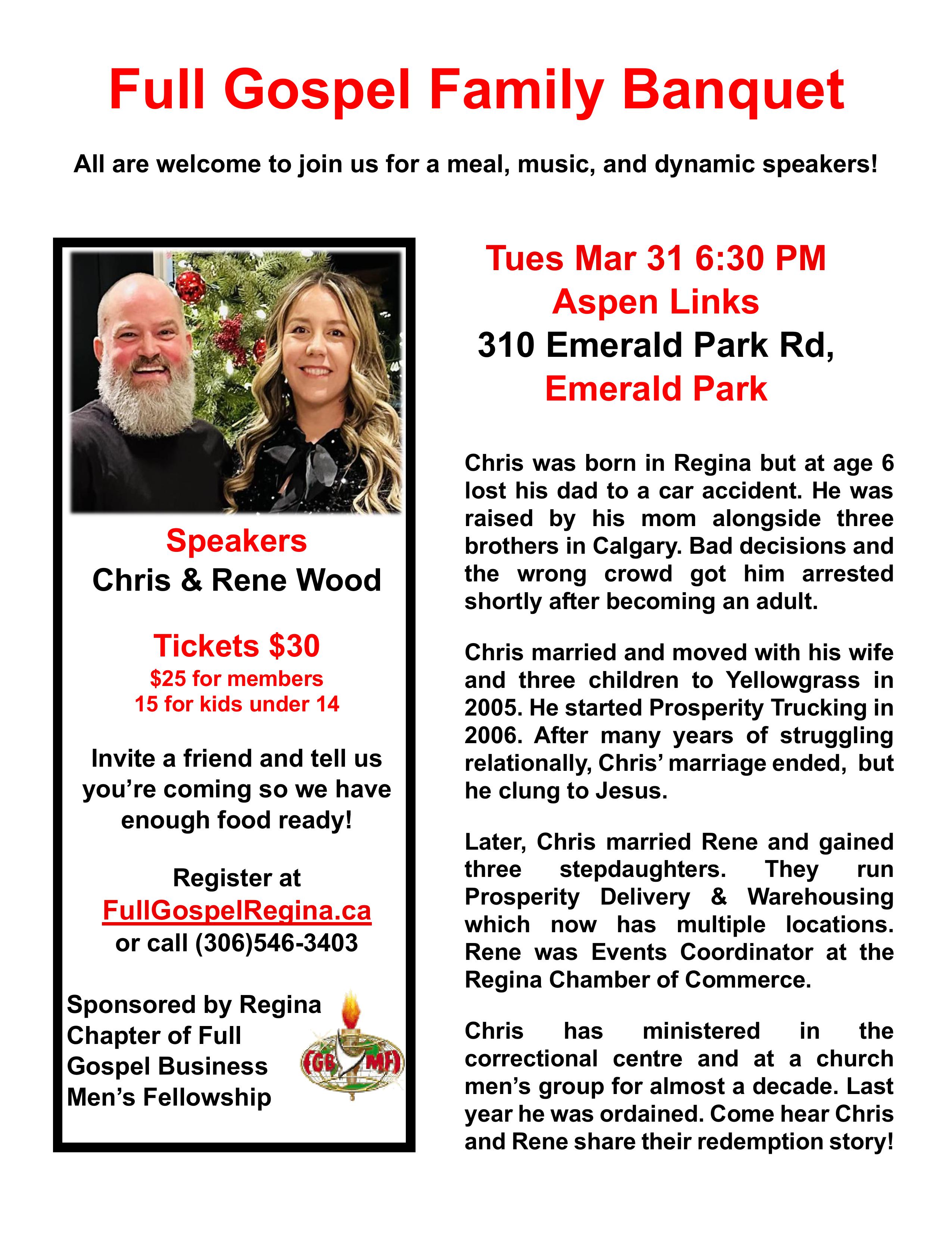 March 31, 2026 – Full Gospel Family Banquet (Speakers: Chris & Rene Wood)
